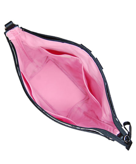 背ポケット付き。天ファスナー付き。内装の前後に二つポケット付き。