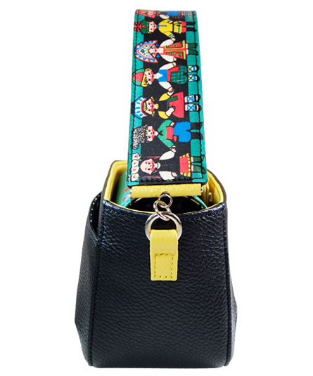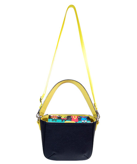 黒の本体とのコンビとして、手紐裏と内装上部へイエローの革が使われ、そして、ショルダーテープのカラーにもイエローが配色されています。
