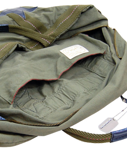 内装にポケット一つレプリカのフランス軍パラシュートバッグに、大小様々なメタリック革の星をパッチワークしたもの。