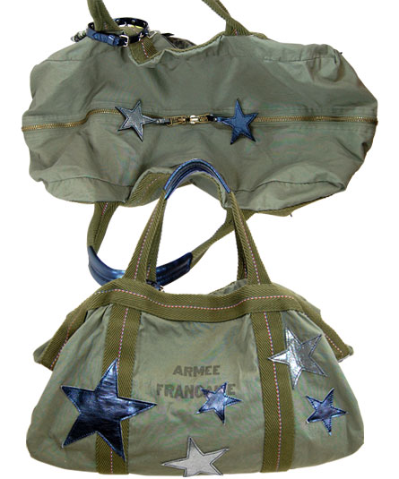 内装にポケット一つレプリカのフランス軍パラシュートバッグに、大小様々なメタリック革の星をパッチワークしたもの。