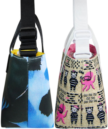 アイボリーの麻目のベースにマリンストライプの猫とタコのプリントとブルーのベースに黒の水墨画の様な大きな花びらに隠れる猫のプリントの二色展開。