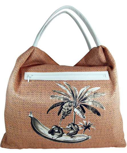 シルクタッチのソフトな生地にコーヒー袋の様な粗い麻生地のだまし絵風のプリントがユニークなセミショルダーバッグ。