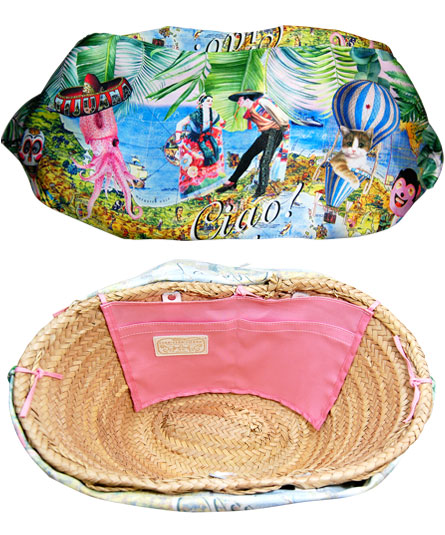 サテン生地には、カリブの島々が描かれた地図の上に南国の動植物のイラストがプリントされていてトロピカルなイメージが広がります。