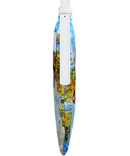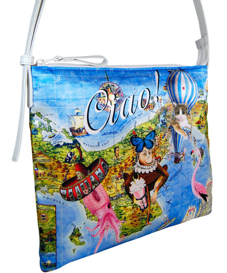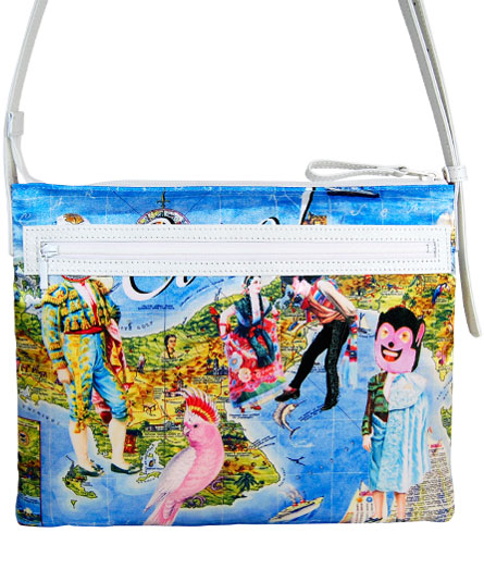 サテン生地には、カリブの島々が描かれた地図の上に南国の動植物のイラストがプリントされていてトロピカルなイメージが広がります。