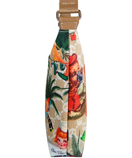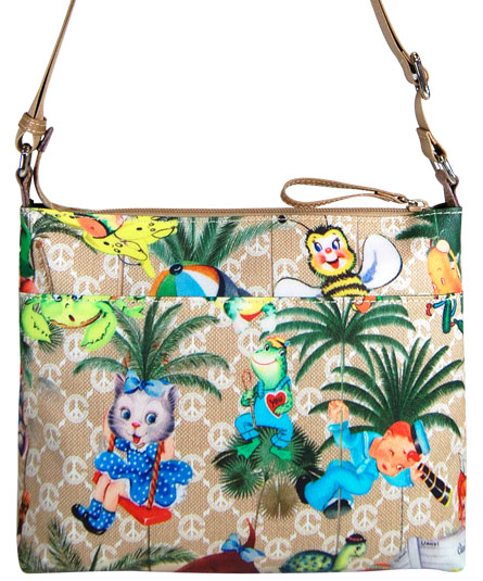 その上に様々な種類のヤシが並ぶ水辺の風景の中で、遊ぶキャラクターのイラストをコラージュしたファンタジックな世界が広がるプリント。