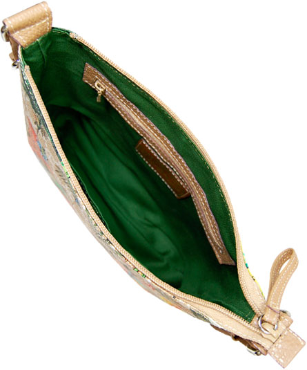 ベージュと白のモノグラムプリントにグリーンのカラーをポイントとしたプリント、それに合わせた内装のグリーン。