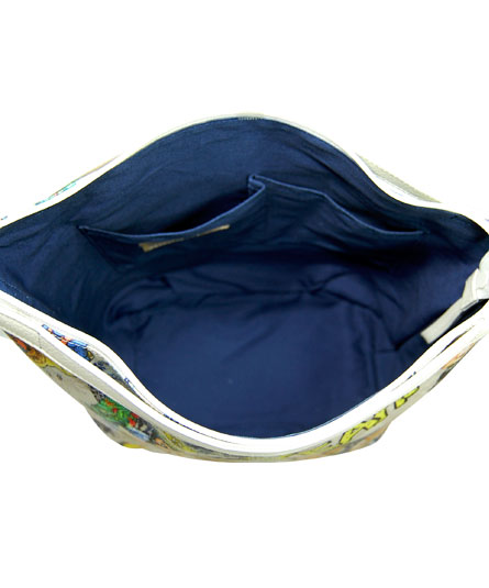 背ポケット付き。天ファスナー付き。内装の前後に二つポケット付き。