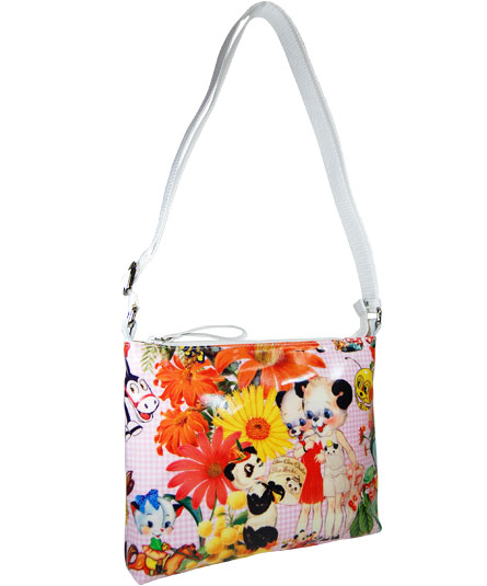 今シーズンのプリント柄は、ピンクと白の細かいギンガムチェックをベースに、昭和の時代の子供達の甘い思い出の世界と花々を散りばめたノスタルジックに表現したコラージュプリントです。
