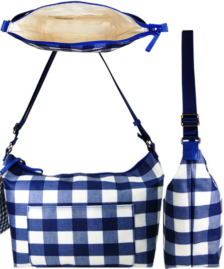 本体の大きなギンガムチェック柄の生地は、表面にビニールコーティングされていますので、汚れや多少の雨にも強いです。
