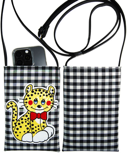 細かいギンガムチェック生地の上に、昭和の時代に描かれた様な懐かしい豹と犬のイラストがパッチワーク刺繍されています。