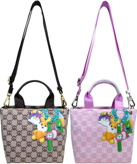 ティーンエイジャーが、チャームやマスコット等をバッグ一面に付けているイメージをプリントで起こしたトロンプルイユ(だまし絵)バッグ。