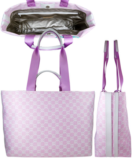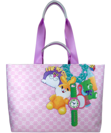 ティーンエイジャーが、チャームやマスコット等をバッグ一面に付けているイメージをプリントで起こしたトロンプルイユ(だまし絵)バッグ。